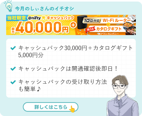 | キャッシュバックの受け取り方法 | ①申し込み後に届くフォームに口座情報を入力する。(電話でも可) ②@nifty光の開通確認後、振り込み |