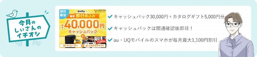 | @nifty光 | 30,000円 + 無線ルーターor カタログギフト5,000円相当 | 即日 | スマホ割(au, UQ) | 4,268円~ |