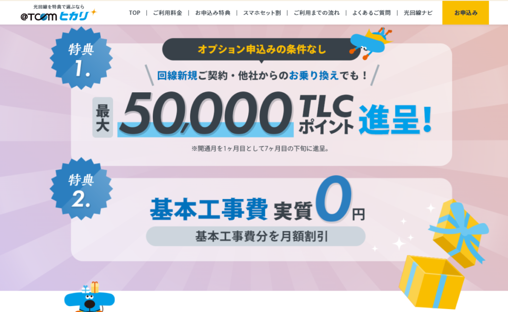 - 最大40,000円キャッシュバック+工事費実質無料