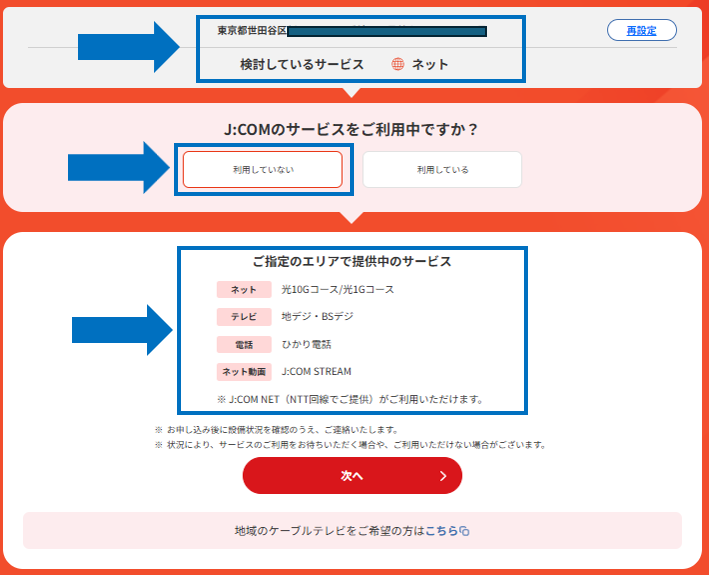 「光10Gコース/光1Gコース」表示されたら、提供エリア内ということになります。