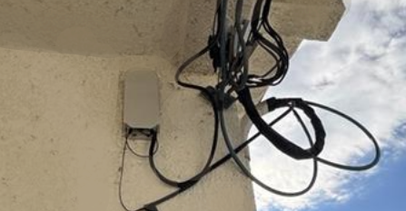 この引留め金具と、外からの各種ケーブルを中に入れる引き込み口の距離がある場合は、線が垂れないように外壁に固定をします。